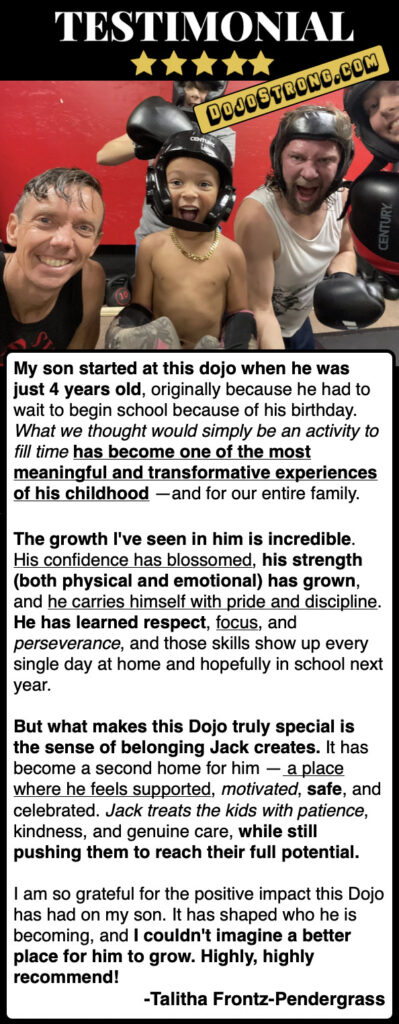 I am so grateful for the positive impact this Dojo has had on my son. It has shaped who he is becoming, and I couldn’t imagine a better place for him to grow. Highly, highly recommend!”